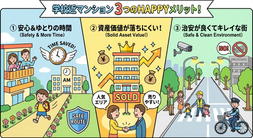 - 交通事故や犯罪リスクの低減: 通学路が短いほど、トラブルに巻き込まれる確率を物理的に下げられます。
