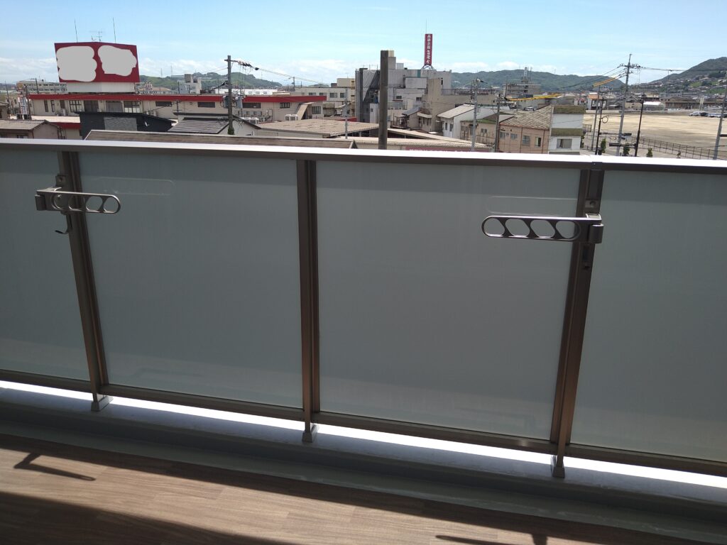 私が購入したマンションも、ヴェルディ・ステーションテラス出雲も、4階のバルコニーのガラス手すりは、シルキータイプと言って、白っぽく色がついた透けないガラスを用いています。↓