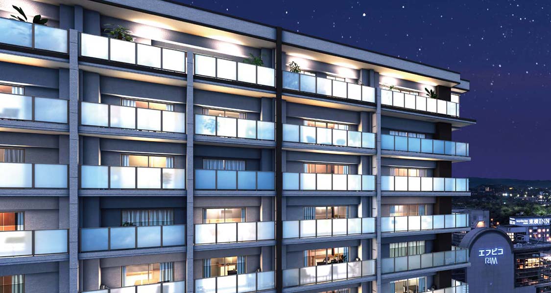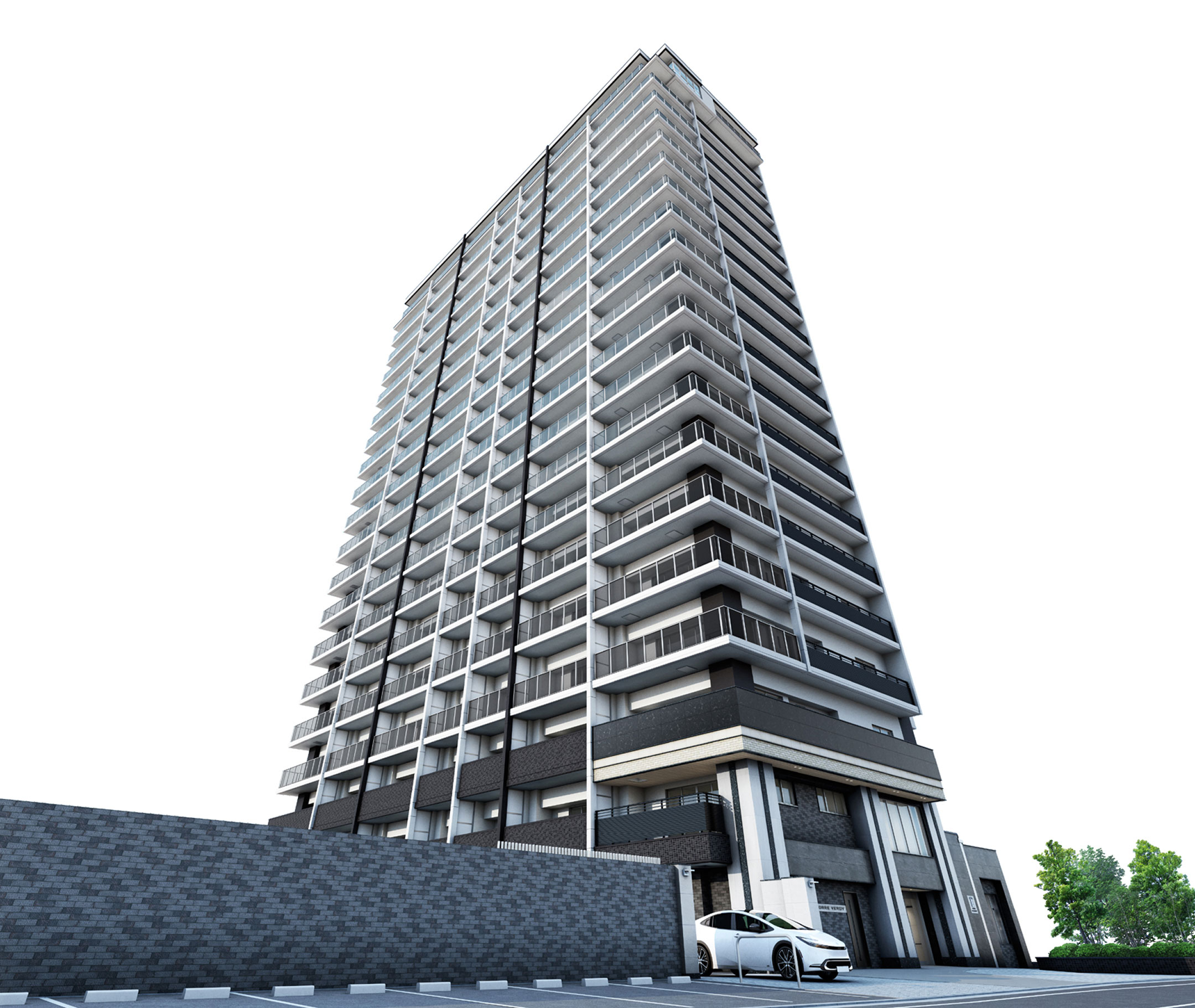 柱に配した御影石で表現された直線的なデザインが、伸びやかで堂々たるタワーレジデンスの印象を見せます。