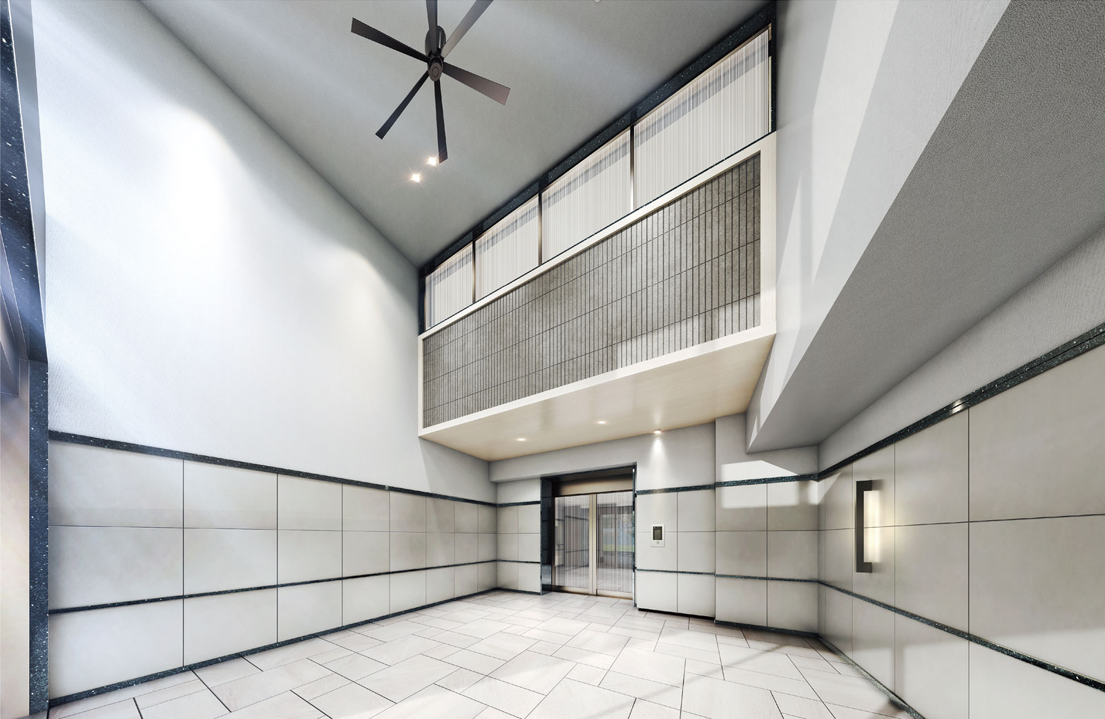 迎賓スペース。全面がガラス張りのエントランスドア。その先に広がるのは、心地よい開放感と優美な印象を見せる二層吹抜の風除室です。