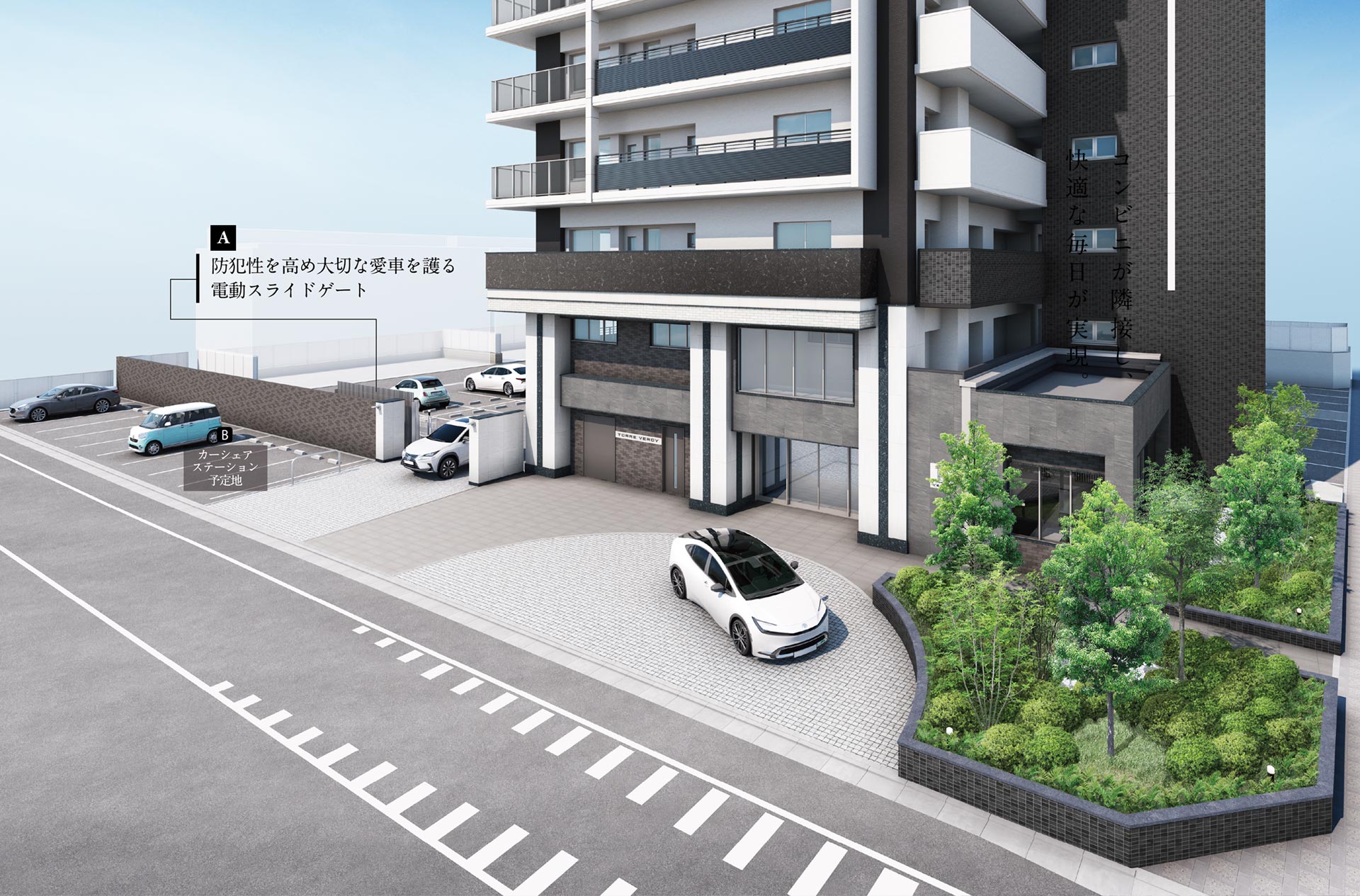 24時間いつでも利用できる、カーシェアステーションを隣接地に設置予定。
