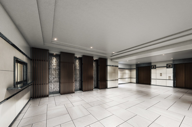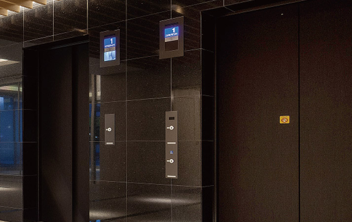 大型のツインエレベーターはお住まいの居住階しかボタンを選択できない仕組み※で、外部からの不法侵入をシャットアウト。訪問者は居住者がロックを解除しないとエレベーターの操作ができず、訪問階以外では降りることができないフロア制御を設定しています。