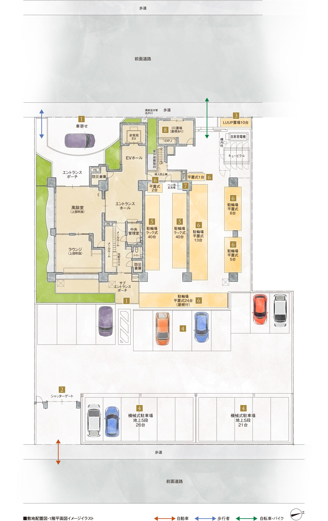マイカーのある便利で快適な生活をしっかりとサポートするため、敷地内に平面式駐車場と機械式駐車場をご用意しました。