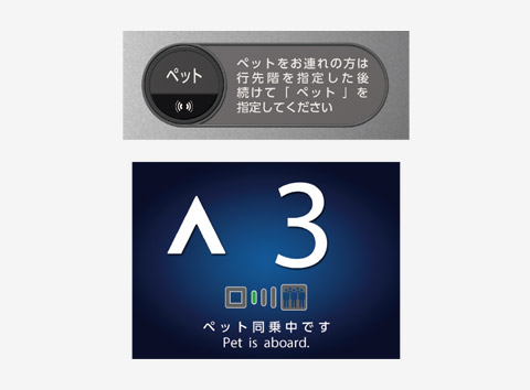 エレベーター内の「ペットボタン」を押せば、乗り場のインジケーターにペットが同乗していることを表示。動物が苦手な方へお知らせできるほか、ペット同士の乗り合わせを避けることもできます。
