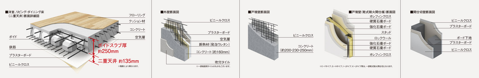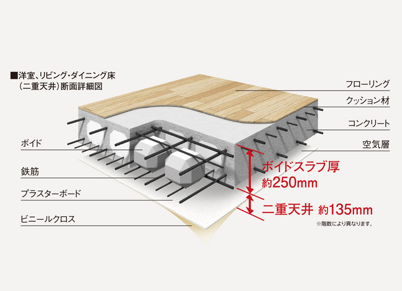 ボイドスラブ厚は約250mmに設定※。スラブ内に空間がない構造により、高い構造強度を維持します。さらに二重天井の採用により、上下階からの振動や生活音を抑え、メンテナンスやリフォームのしやすさにも配慮。戸境壁※の厚さは約200・230・250mmとし、静かで快適な住環境をめざしました。外壁は約160mmの厚さを確保するとともに、断熱材やプラスターボードを使用することで断熱性が高まり、外気温の影響を抑え、省エネ性や快適性が高まりました。