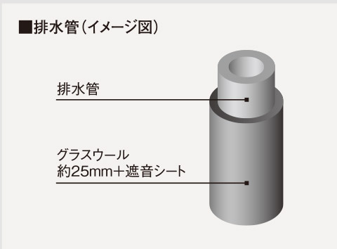 PS排水管には遮音シートを巻くことにより、湿気や音に対して配慮。また、PS排水管・水廻り部分と居室の間仕切壁内にグラスウールを入れ、遮音性を向上させています。