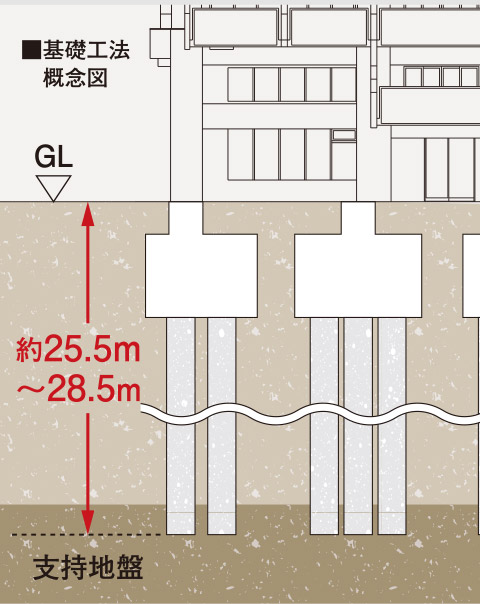 マンションを支える杭は、その先端を支持地盤となる強固な地層まで打ち込み、杭全体の摩擦抵抗力と先端の支持力によって建物の堅牢性を高めます。地震時の液状化にも対応した、強度の高い杭基礎を実現しています。