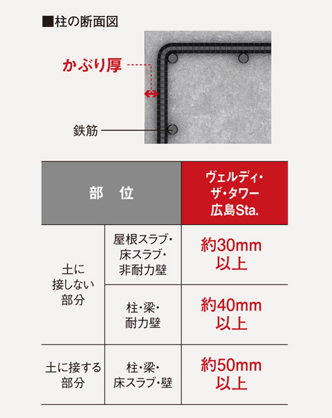 かぶり厚とは、鉄筋(主筋・帯筋)を覆うコンクリートの厚さのことです。「ヴェルディ・ザ・タワー広島Sta.」では約30mm〜約50mmの十分な厚みを確保しており、鉄筋の錆びを抑制することができます。