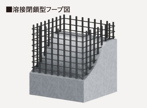 柱の帯筋には、予め工場で溶接した溶接閉鎖型フープを採用。鉄筋を折り曲げてフック形状とする従来の工法と比べ、耐震性の高い柱を実現させることができます。