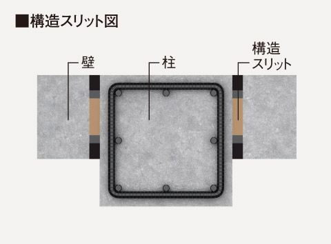 地震発生時に、柱や梁が強大な力で外壁と干渉しあってせん断破壊するのを防ぐために、構造スリットを導入。柱と壁の縁を切ることで、耐震性を確保しています。