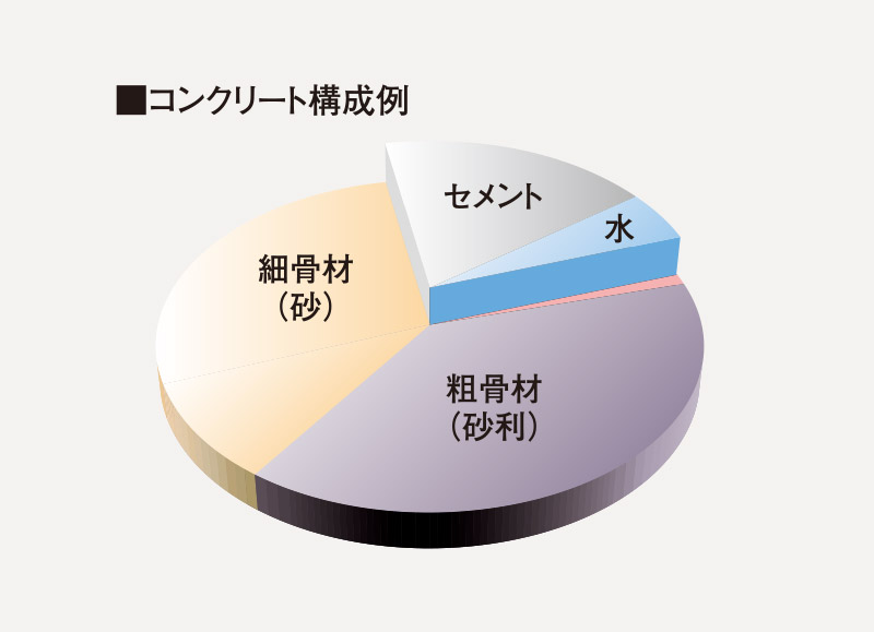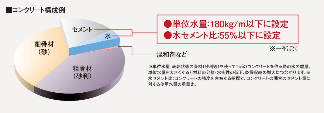 コンクリートは水量が多いとひび割れが起きやすくなり、水や炭酸ガスが侵入しやすくなります。そこで水の比率を低く抑えるために、単位水量と水セメント比の基準を設定し、配合段階で劣化を軽減する対策をとっています。配合に際しては、コンクリート技士が管理し、品質には万全を期しています。