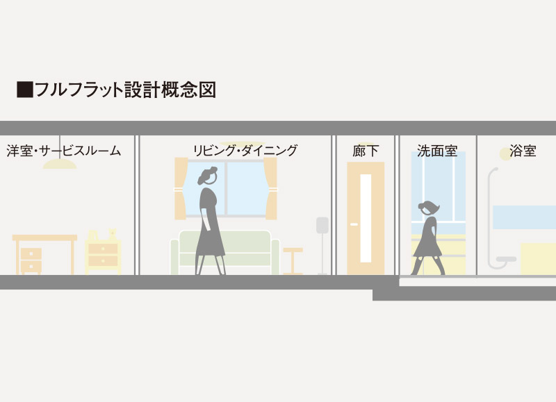 住戸内のすべての床段差(玄関部分を除く)を解消したフルフラット設計を採用。つまずきや転倒などの事故を防ぎ、いつまでも安心して暮らせます。また、掃除機の移動がラクにできるのもうれしいメリットです。