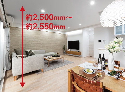 下り天井部分を除く。※階数によって高さが異なります。詳しくは係員にお尋ねください。※A〜Hタイプは2,500〜2,550mm。